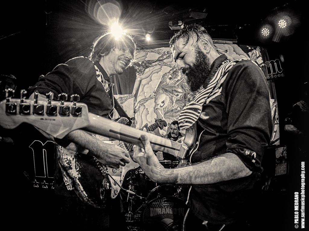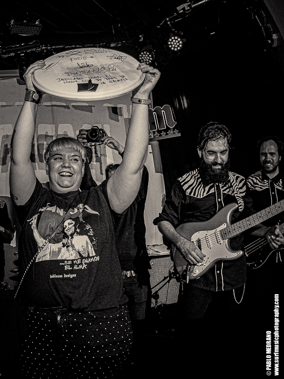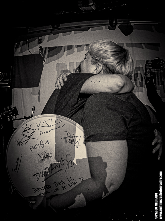 El concierto fue una mezcla de los ya conocidos pelotazos de Durango 14, con su inconfundible surf & roll espeso, junto con los nuevos temas del disco, algunos de ellos de verdadera categoría y directos a la mandíbula, hasta llegar a la vientena . Y contó con su momento emotivo, la entrega de un parche de batería firmado por todos los miembros de la banda, premio a un sorteo organizado por el Club de Fans y que recayó en quien mejor podía hacerlo, Vane, una de las más grandes fans de la banda. Bonito detalle de la banda con los que les han apoyado desde el inicio, sus fans incondicionales. Por cierto, que la batería tiene un nuevo dueño, Íñigo, que me encantó no solo por su ejecución impecable, sino por su compromiso y simpatía. Ojalá que sea por mucho, mucho tiempo.